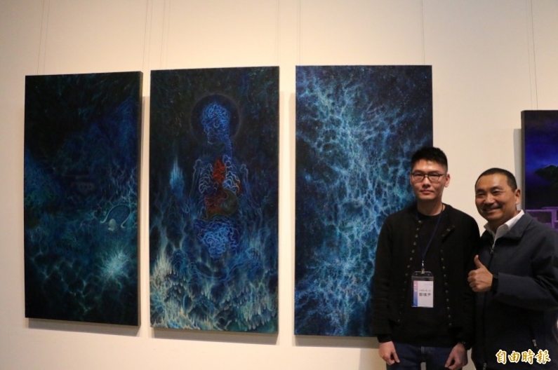 新北市長侯友宜與油畫類第1名得主鄭慎尹合影,作品《芳蘭山風景》是3連幅高1.5米的系列作品。(記者何玉華攝)