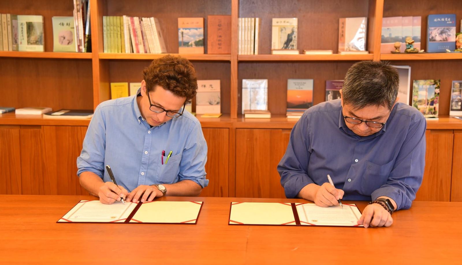 華梵大學李天任校長(右)與加德滿都大學朗中葉什研究所佛學研究中心Dr. Philippe Turenne簽訂合作備忘錄。