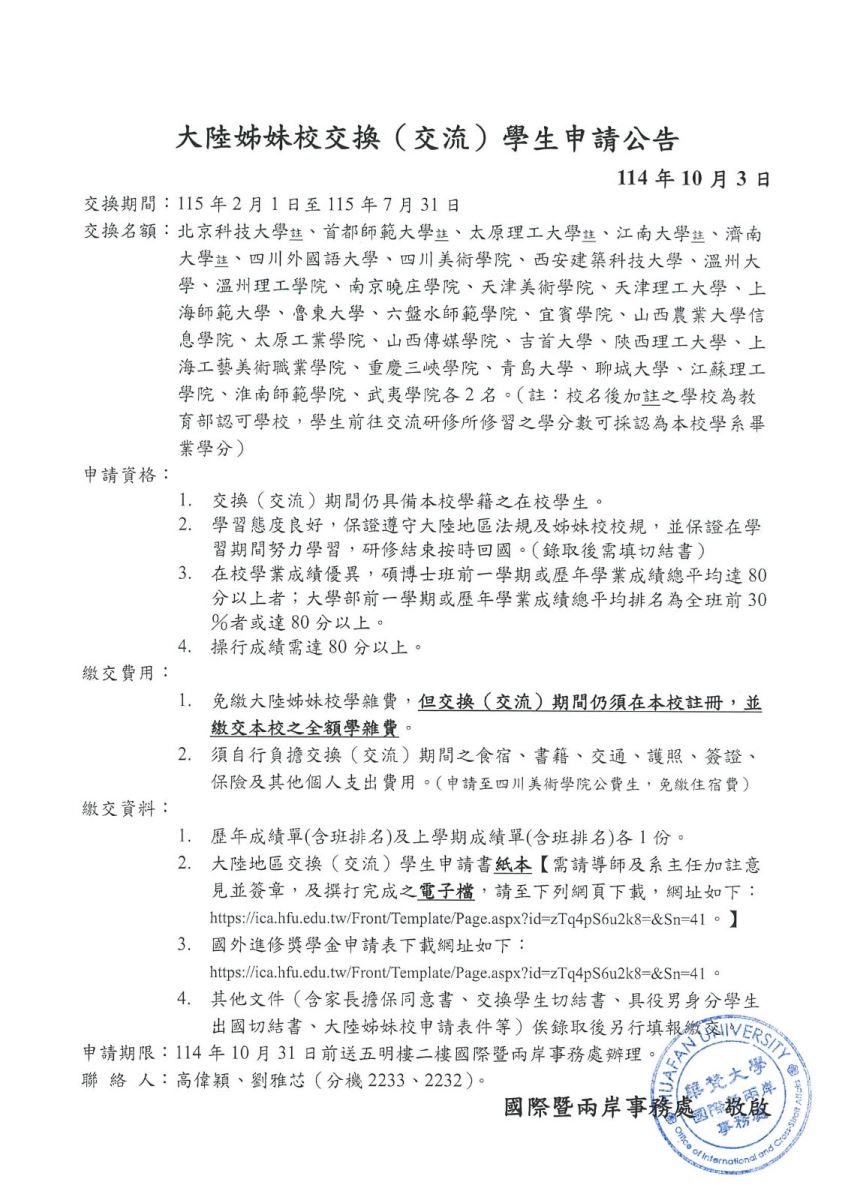 【114學年度下學期大陸姊妹校交換(交流)學生申請開跑!】