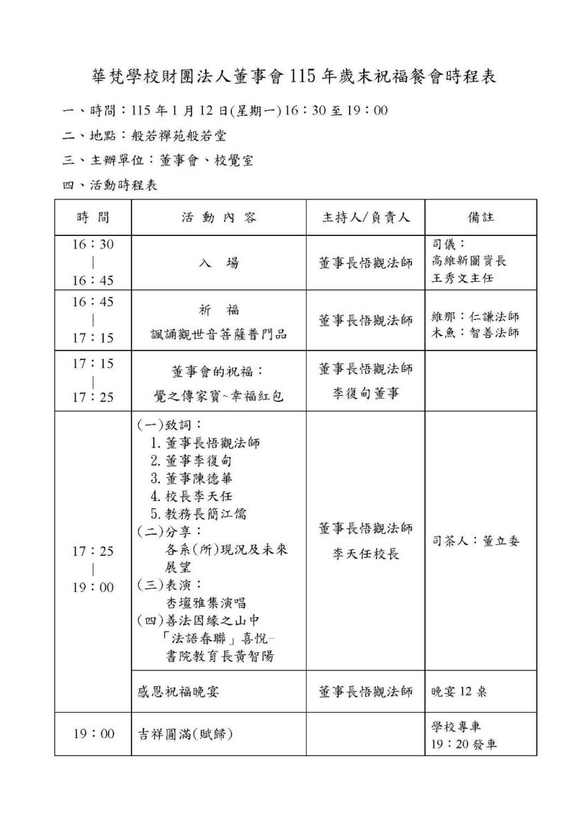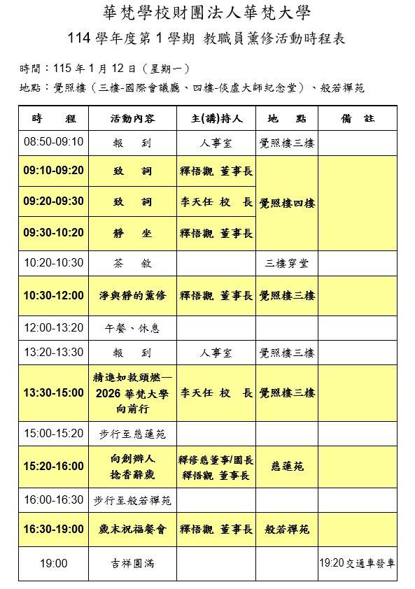 華梵大學教職員「薰修」活動的特色與教育內涵 : 華梵大學114學年度第1學期 教職員薰修及歲末祝福餐會時程表