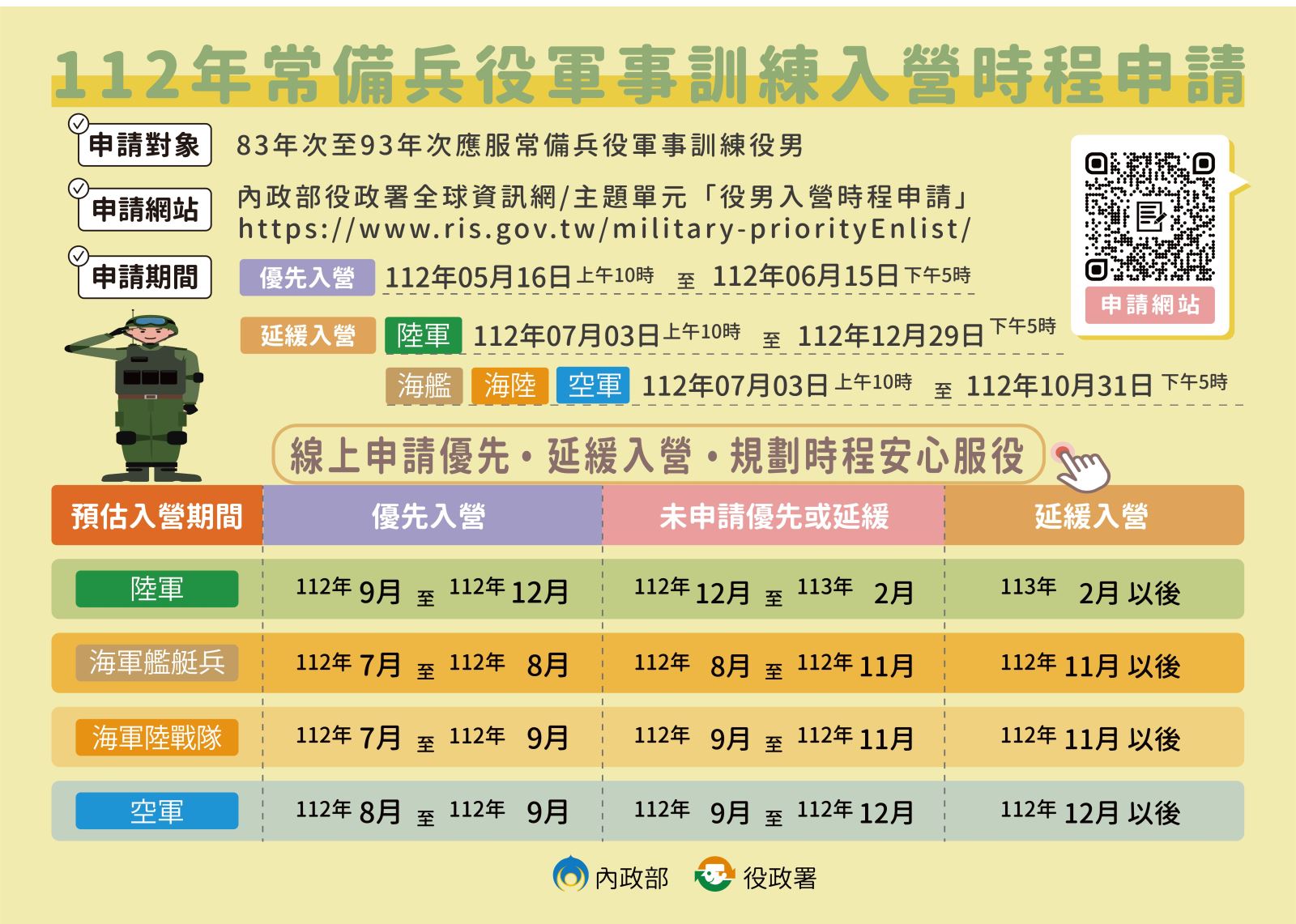 內政部辦理112年應接受常備兵役軍事訓練役男,申請優先入營或延緩入營案