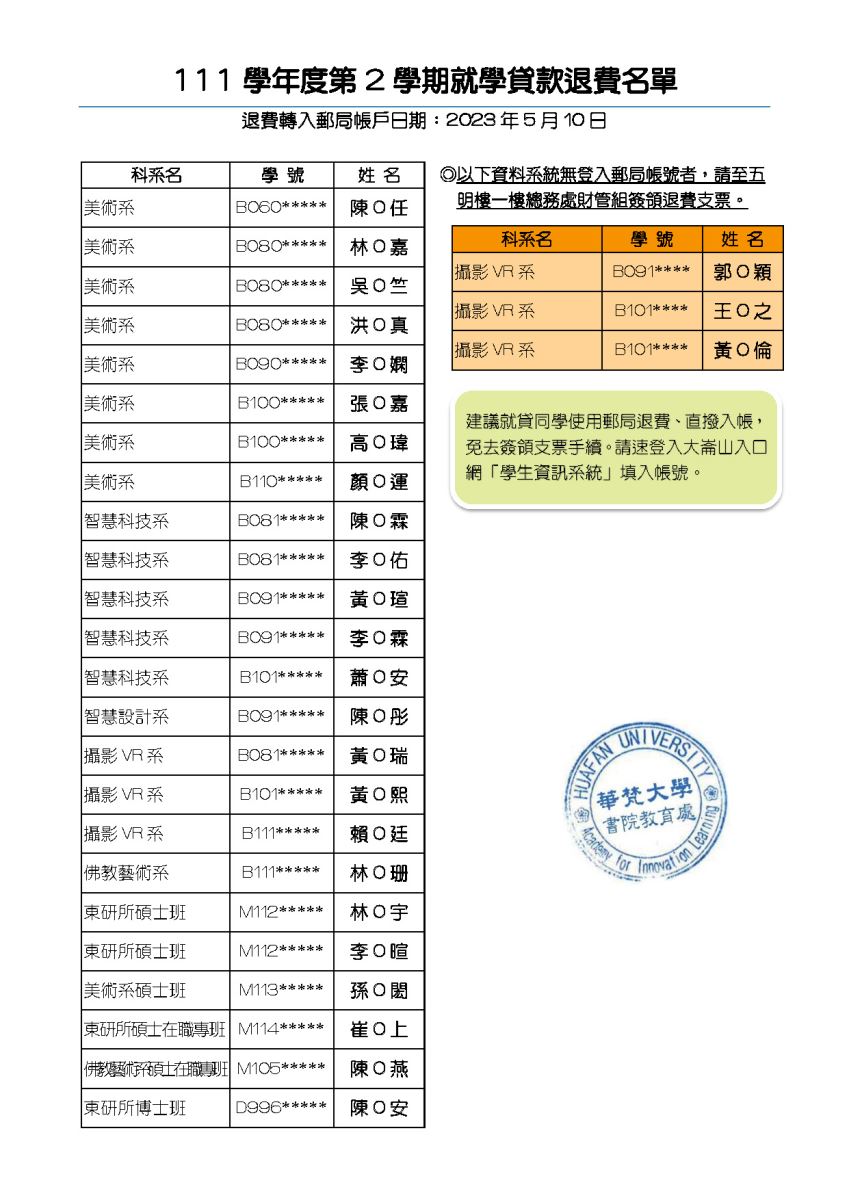 一、本學期申貸書籍費、校外住宿費、生活費者,訂於112年5月10日轉入個人郵局帳戶。