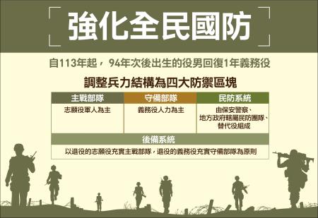 和平靠國防,而國防靠全民。面對未來嚴峻區域衝突與挑戰的變局,政府除回復徵集1年役期義務役,建立適足的防衛戰力外,亦將透過主戰部隊與守備部隊相互合作,對外拒敵進犯野心,對內達守土衛民之效,並在地方民防單位及後備部隊支援下,打造全方位戰力,讓國家更安全。