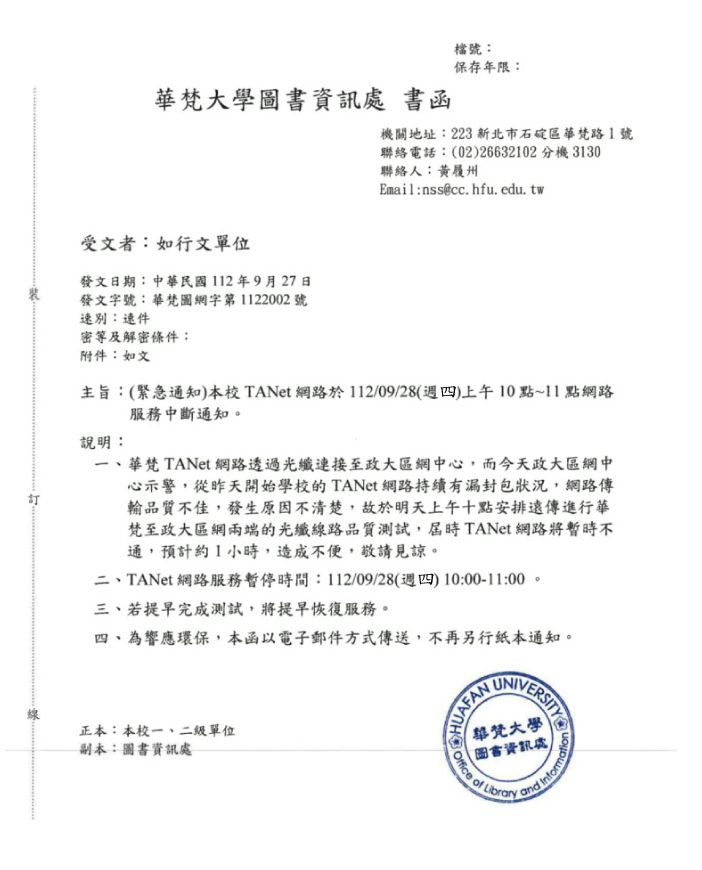 緊急通知★【圖資處】網路中斷服務112/9/28(週四)上午10:00~11:00