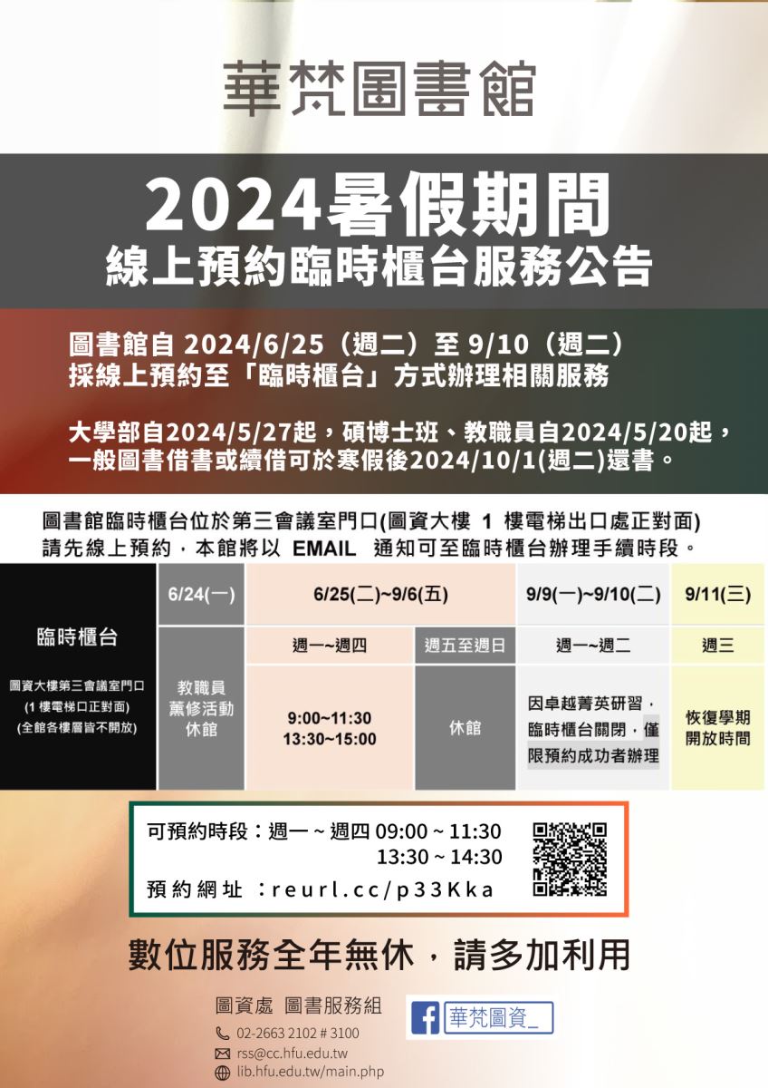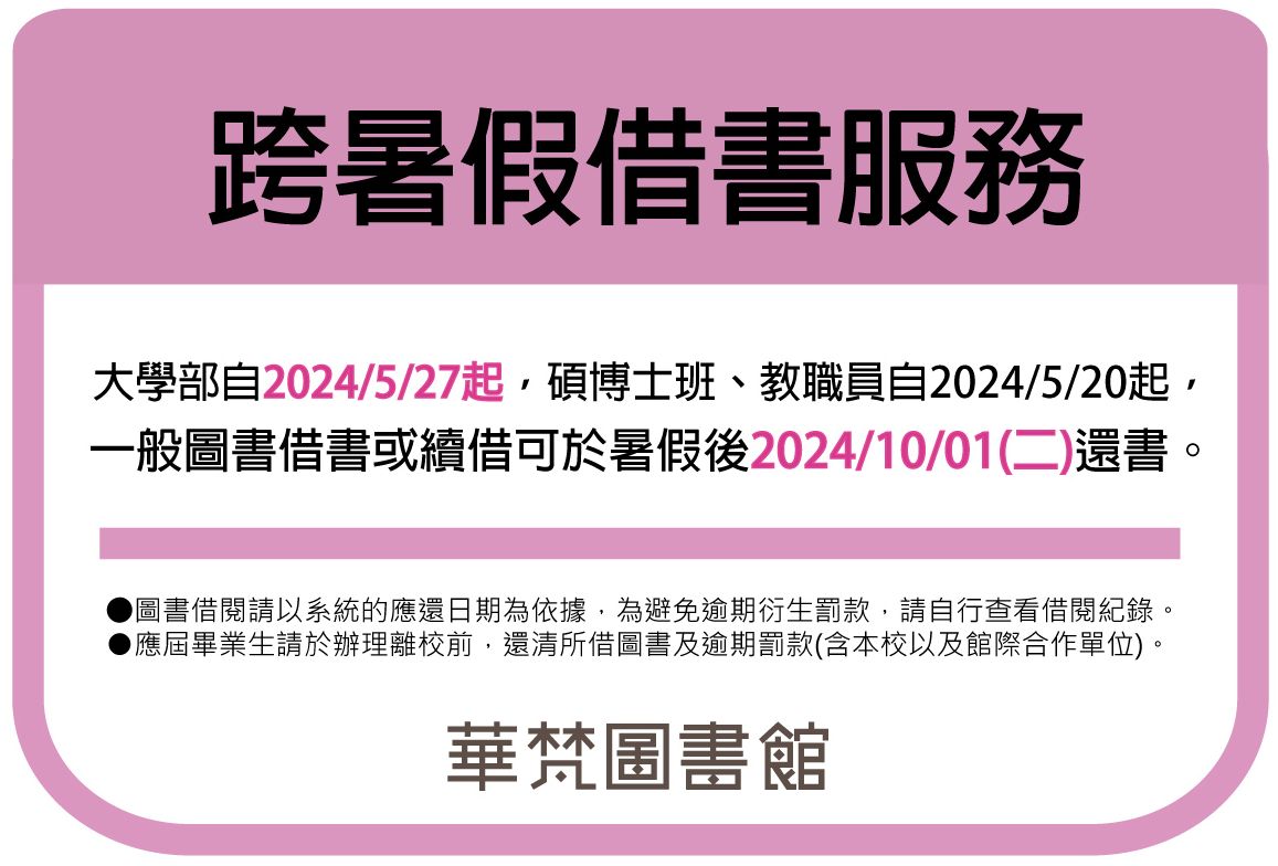 【華梵圖書館】2024年暑假期間圖書館服務說明(實施日期