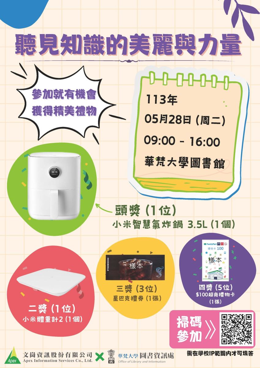 欲抽大獎2024/5/28週二9:00~16:00請至圖書館1樓洽詢!