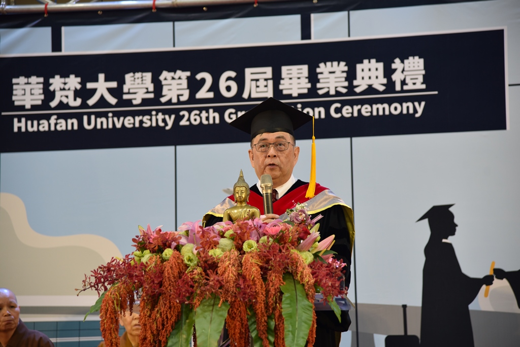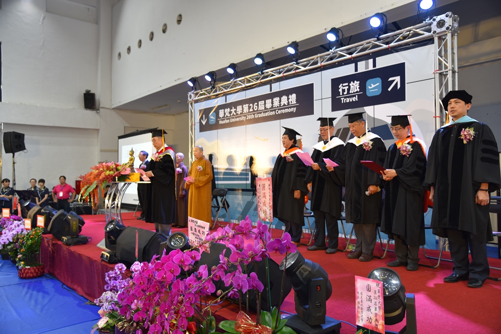 華梵大學第26屆畢業典禮「行旅」於6月1日上午在本校于藝館三樓舉行,典禮由校長李天任主持,並邀請華梵大學董事長悟觀法師及韓國建國大學校長閔相基博士致詞,鼓勵708位華梵應屆畢業同學大步跨出,勇敢邁入社會。