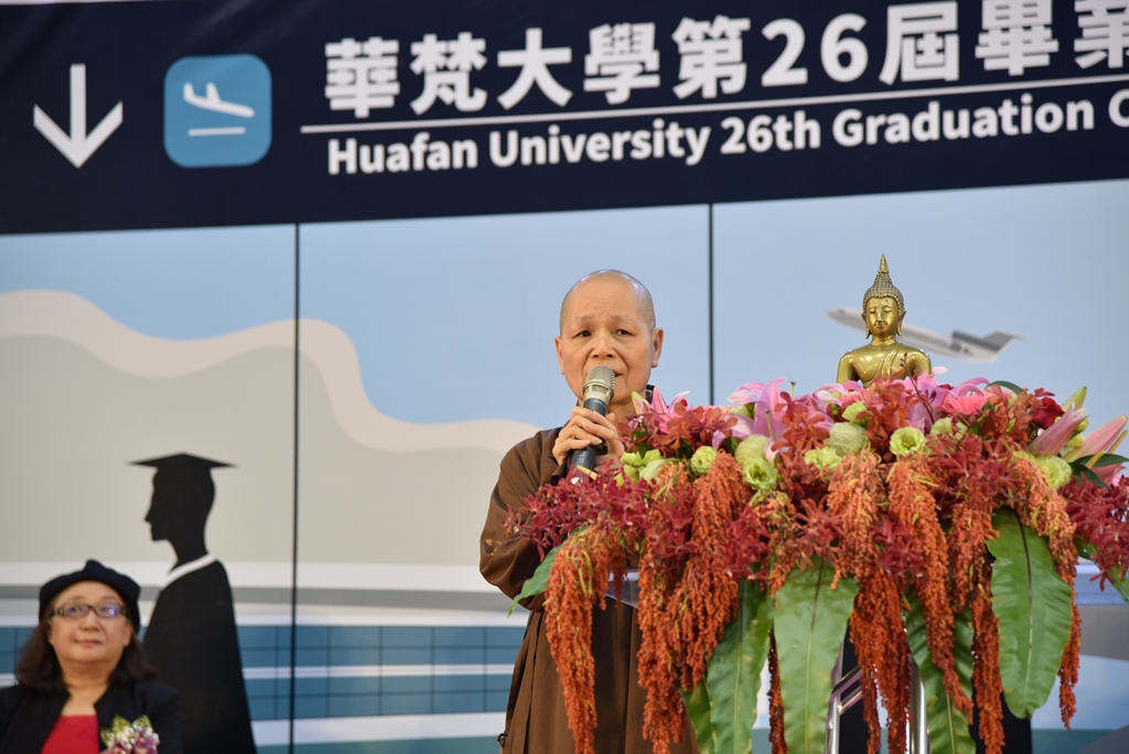 典禮首先由董事長悟觀法師致詞,悟觀法師勉勵同學,對家人、師長、同學保持感恩的心,希望同學身心健康、才有辦法學以致用,更希望同學出校門後,以慈悲心待人,以智慧判斷做事,則慈悲與智慧自能相融,正如華梵辦學精神:「慈悲與智慧相生」。