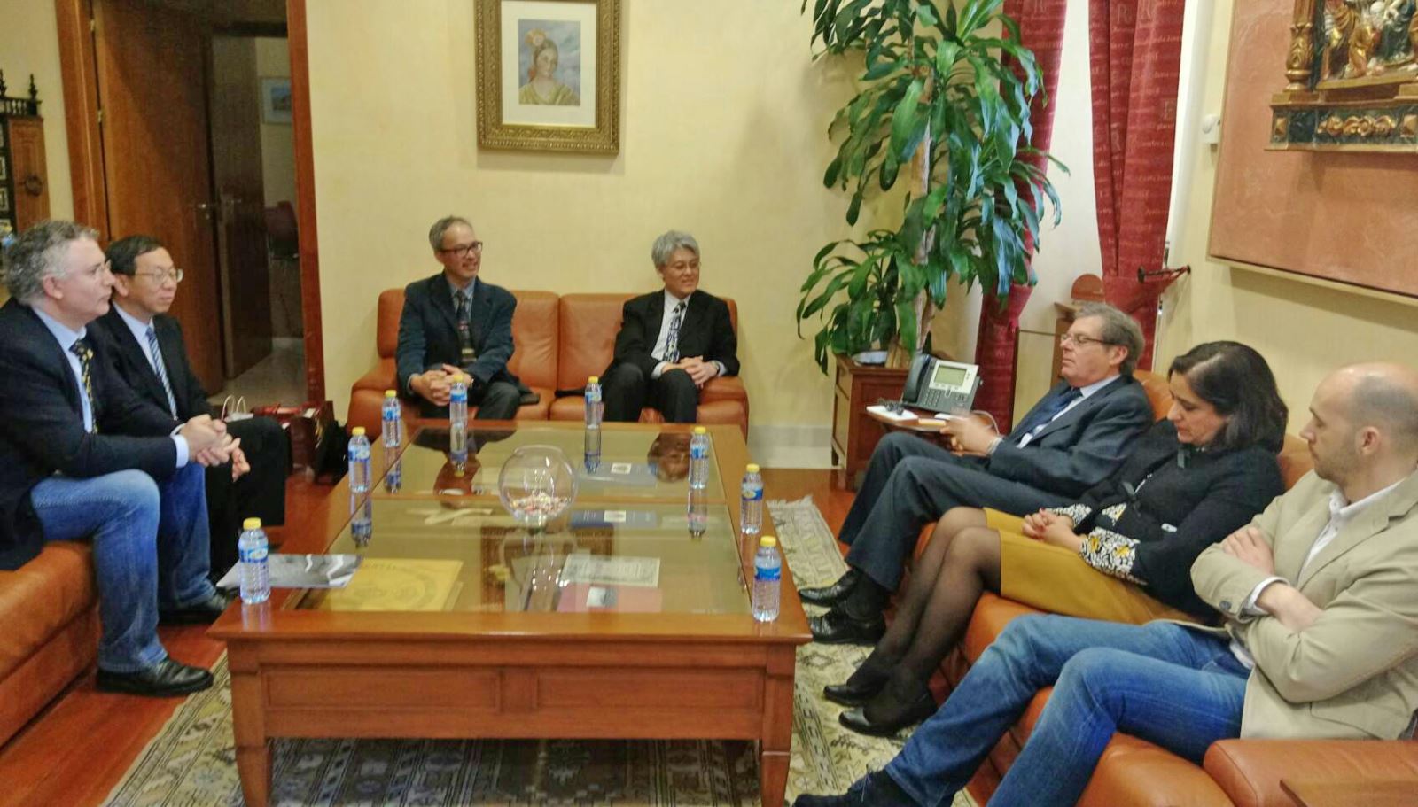 4月4日高柏園校長(中)一行參訪卡斯提亞拉曼查大學(UCLM)昆卡校區,受到昆卡校區校長Maria-Angeles Zurilla-Carinana(右四)、國際事務暨教育學院副院長 Julian Serrano Heras(左四)、藝術設計學院院長Dr. Javier Diez de Baldeon(左五)、國際關係處代表David Segovia Llanos(左三)熱烈歡迎與接待,中華民國駐西班牙代表處柯森耀大使(右三)也從馬德里特別趕來參與。