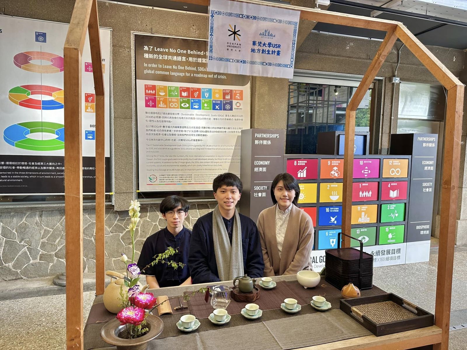 華梵大學書院教育處課外活動組組長董立委(中)與「冬季茶藝文化交流展演:無事甲茶會」司茶同學合影。