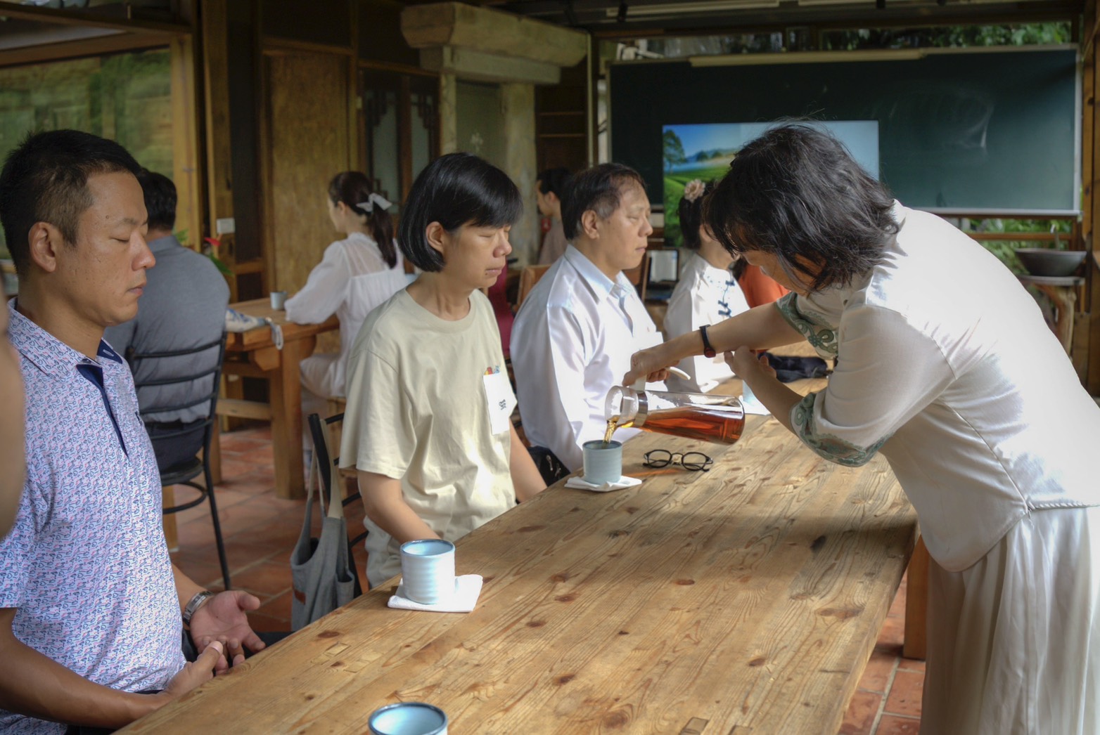 名模姚采穎全程與華梵教職員參與整場靜心茶會。 您信不信,喝七碗千年古茶就可以淨滌身心,與自己對話;華梵大學舉辦了一場特別的「七碗靜心茶會」,邀請教職員品嚐中央山脈甘甜醇美的珍稀千年古茶,再透過儀式引導,讓茶氣飽滿、氣運全身,連名模姚采穎都前來體驗「禪茶一味」的美妙境界。 「七碗靜心茶會」22日在華梵大學地方創生團隊運營的雲山禪茶藝文舉行,邀請已辦過一千多場「禪茶一味」茶會的茶道師吳慧珍主持。