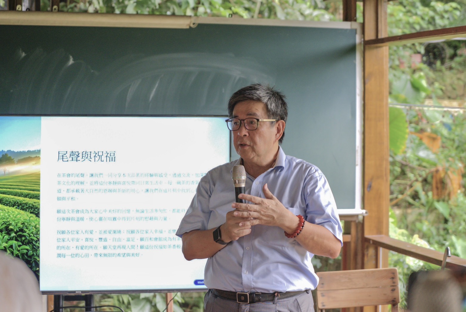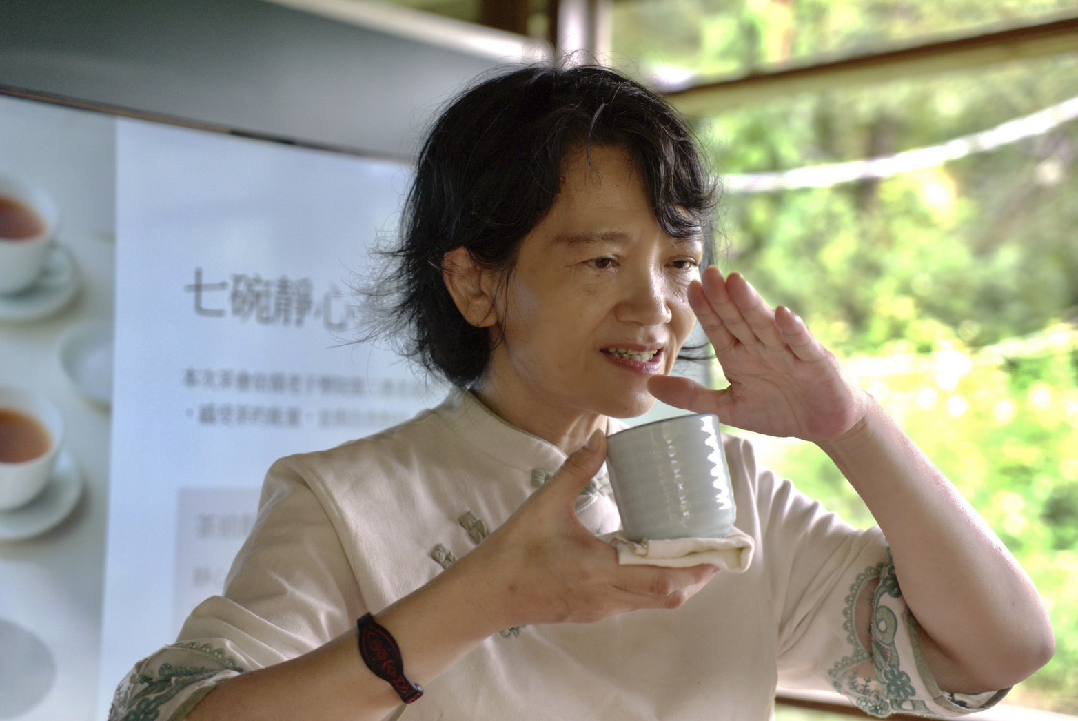 吳慧珍老師說,七碗茶的歷史可追溯到唐代詩人盧仝的詩作〈走筆謝孟諫議寄新茶〉,後人節錄為〈七碗茶歌〉,意指每喝一碗茶都能感受到不同的意境;到了當代又被改編為〈新七碗茶歌〉,分別為「一碗喉吻潤;二碗破孤悶;三碗文思湧;四碗發輕汗;五碗肌骨清;六碗通仙靈;七碗罷罷罷,直叫新我替舊他」。 吳慧珍老師細心講解過程。 為了讓華梵教職員感受到「禪茶一味」的殊勝妙味,吳慧珍老師此次特地帶來據傳生長在玉山國家公園二千到三千年間、號稱台灣最頂級的野生古樹茶「蓬萊仙茶」給大家品嚐,並透過吟誦茶偈、茶語與茶歌,引導大家同步品茗,進入靜心狀態,感受茶的能量,並與自我對話。 據了解,蓬萊仙茶外銷一斤要價17萬台幣,喝下去後,唇齒與呼吸間盡是甘甜的蔗糖香與花香,令人神清氣爽;品茗後,吳慧珍老師再指導大家透過輕柔的拍打動作,疏通經絡,促進氣血循環,將體內濁氣排出;最後並懷抱感恩之心,感謝天地、茶葉與所有參與者,送上真摯祝福,完成獨特的「禪茶一味」體驗。 吳慧珍老師示範用掌心感受茶杯溫度。 特別的是,茶會舉辦期間,窗外忽晴忽雨,光線忽明忽暗,大家靜心品茗,與大自然的風聲、雨聲、搖曳擺盪的山林綠影互動,感受細雨灑在臉上、微風拂在身上的舒適感,原本糾結的身心都全部鬆開了,達到一種清安的境界,參加者都覺得不可思議! 吳慧珍老師奉茶過程。 華梵大學李天任校長說,感謝吳慧珍老師給他兩個小時細細品茶,讓他能好好感受自己的身體,風雨聲的起落與光線的變化更讓他體會天地萬物自有規律,人生亦是有高有低、有苦有樂。未來華梵將多多舉辦類似活動,開放更多校內外師生與社會大眾參與。 華梵大學李天任校長分享靜心後心得。 名模姚采穎從頭到尾跟著華梵教職員認真參與整場茶會,最後感恩分享,在如此大自然環抱的空間裡,無論風聲、雨聲,從身體、茶道、心的角度,都讓我們把所有的狀態回歸到當下此刻,深深沉浸自己,真是非常棒的體驗。