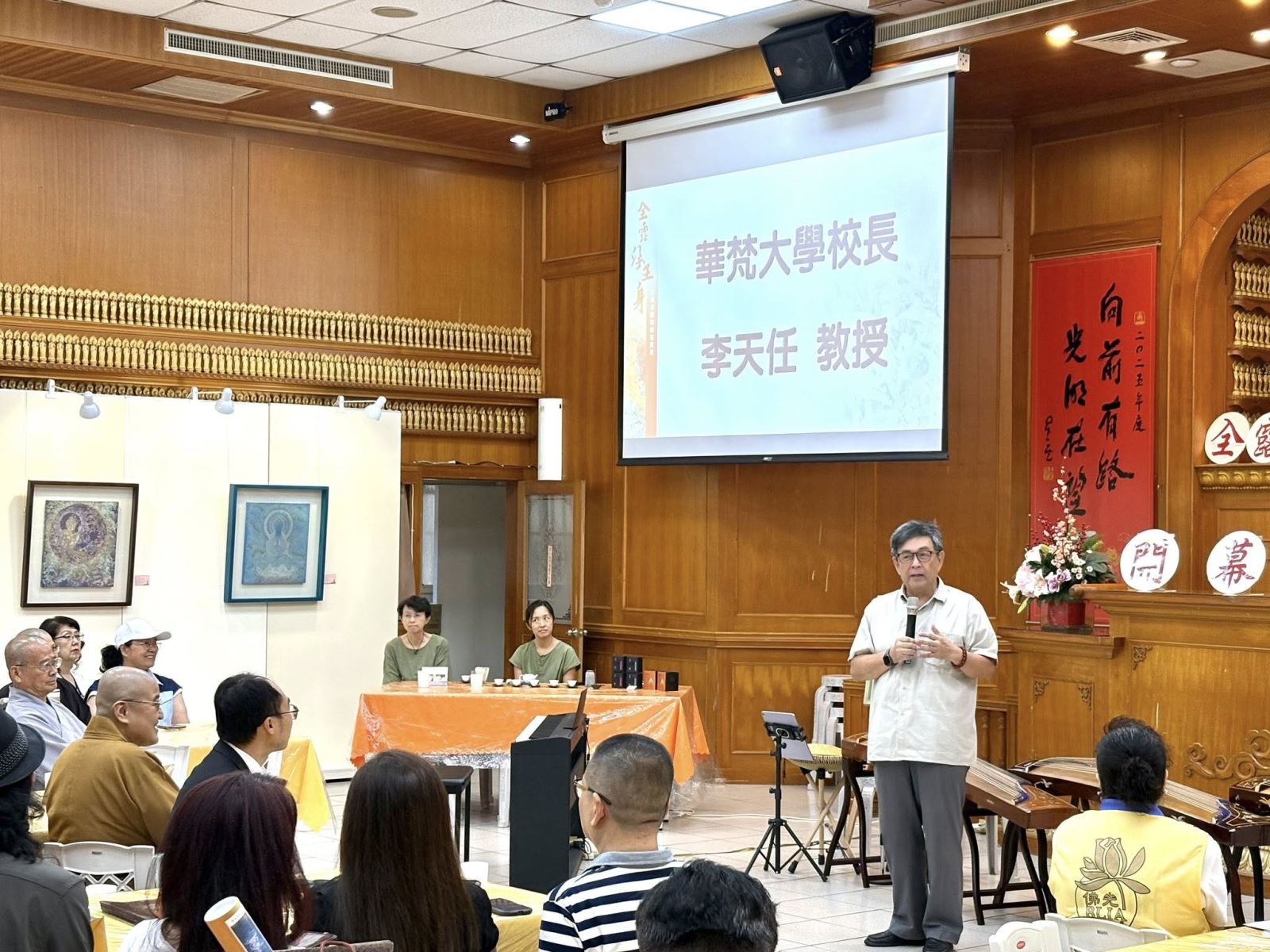 李天任校長致詞表示華梵大學佛藝系是全國大學唯一發展出膠彩佛畫的系所,而且師生一心具有特色。