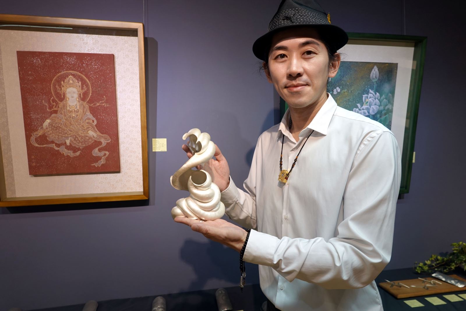 華梵佛藝系教師發起聯展義賣活動,左起:佛藝系廖偉淇老師、善導寺大慧法師、華梵大學李天任校長、佛藝系陳俊吉主任、佛藝系陳高登老師、人文與藝術學院黃智陽院長。 國慶連假做有意義的事,華梵大學佛教藝術學系集結工藝界四大名師,舉辦創系以來首次教師作品義賣聯展,從畫作、陶藝、金工到鋦瓷,以精湛手藝展現時尚、藝術與心靈的雅韻對話,義賣所得將捐助學校整建陶藝教室,讓藝術之美透過教育延伸更遠的力量。 楊英風藝術教育基金會董事長寬謙法師(中)參觀「佛藝雅韻」教師聯展。 「佛藝雅韻」教師聯展於國慶連假期間在華梵大學板橋中心「橋藝術空間」盛大開幕,參展教師陳俊吉、金優石、廖偉淇與陳高登等四人均為佛藝系名師,所開課程經常爆棚;其中,系主任陳俊吉以膠彩佛畫聞名,韓籍金優石專攻手拉坏與陶瓷彩繪,新銳藝術家廖偉淇擅長金工藝術,陳高登則是陶瓷修復鋦瓷藝術專家。 善導寺住持大慧法師(右)仔細欣賞華梵佛藝系廖偉淇老師的展覽作品。 由於這是華梵佛藝系創系以來首次由教師主動發起以義賣形式舉辦聯展,所拿出的130餘件作品個個精雕細琢,從莊嚴華麗的佛畫、時尚精雅的大漆陶罐,到小巧玲瓏的茶具、香座等,風格多元且宗教性、藝術性、生活應用性兼具,開幕期間吸引許多佛教界大老和藝文愛好者前往觀賞。 華梵佛藝系陳俊吉主任與作品〈數珠觀音〉。 善導寺住持大慧法師即致詞表示,藝術不僅可以豐富生活,更能豐富生命,踏進展廳看到這麼多高水準的作品,深深感受到華梵佛藝系的老師都是用生命在創作,希望參觀者滿載而歸。 華梵大學佛藝系金優石老師的陶藝作品〈粉青蓮花魚罐〉。 推廣佛教藝術近40年的楊英風藝術教育基金會董事長寬謙法師也說,華梵佛藝系努力讓佛教藝術更普遍存在於大眾日常生活乃至生命層次,此次義賣的作品不僅豐富心靈,又能提高生活品質與作為日常應用,充分展現佛教藝術的具體成就,非常難能可貴。 參觀者對華梵佛藝系陳高登老師的作品〈青瓷銅青蛙香座〉愛不釋手。 華梵大學李天任校長指出,華梵大學是全國第一所佛教界人士創辦的高等學府,推動佛教藝術責無旁貸,感謝佛藝系老師熱心發起作品聯展義賣活動,所得將捐給學校作為華梵窯對面陶藝教室的整建費用,完成後對於陶藝教學、展演、研究與推廣將有更大的貢獻,歡迎大家共襄盛舉。 華梵佛藝系廖偉淇老師展示銀器作品〈自在心境〉。 華梵大學簡江儒教務長與人文藝術學院黃智陽院長說,此次佛藝系四大名師聯展,為學生做了一個很好的示範,從色彩繽紛的佛國世界,到古今元素混搭、既生活又具時尚感的金繕工藝及銀器茶具,都令人愛不釋手,展現了佛教藝術創作的新高度。 現場合影。 「佛藝雅韻」華梵佛藝系教師聯展與義賣活動將進行至10月14日為止,地點在華梵大學橋藝術空間(新北市板橋區文化路二段242號6樓),歡迎社會大眾免費前往參觀。