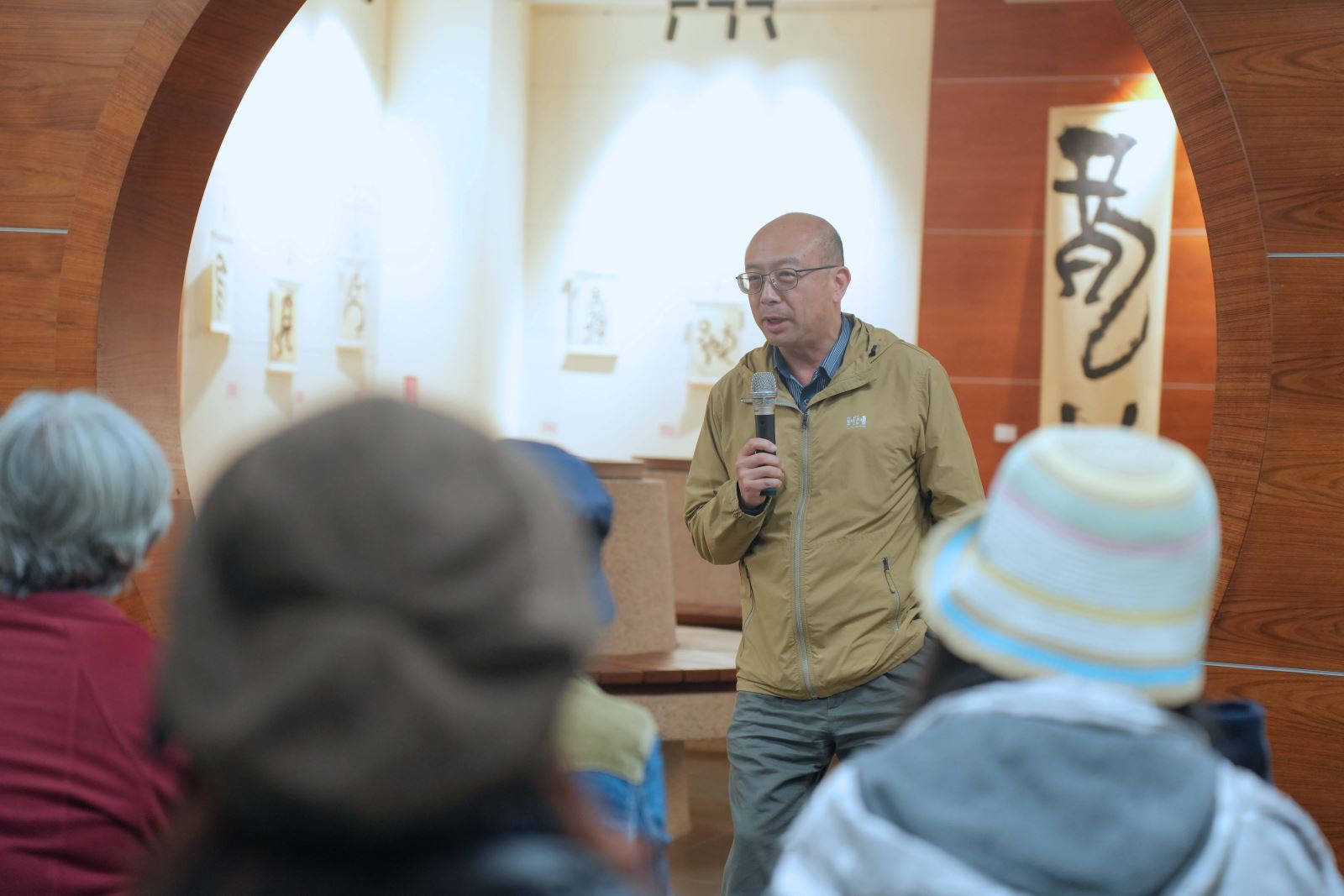 本課成果展策展人佛教藝術學系四年級陳慧銨作品。 誰說寫書法一定要臨摹字帖,不能打破窠臼?華梵大學圖資大樓三樓藝文空間現正舉辦「古文字的世界」書法藝術課程成果展,展現同學在古文字藝術創作上跳脫傳統、自由探索的精神,每件古文字作品都像生動的圖案躍然紙上,令人大開眼界。 張壯熙主任秘書開幕致詞。 開幕式邀請張壯熙主任秘書致詞,他對課堂成果給予高度肯定,並提醒,教育的價值不僅在技藝本身,更在於學生能透過不同老師、不同課程獲得多元的養分滋養,鼓勵同學保持開放心態,在學習中享受與人相處、彼此欣賞的過程。