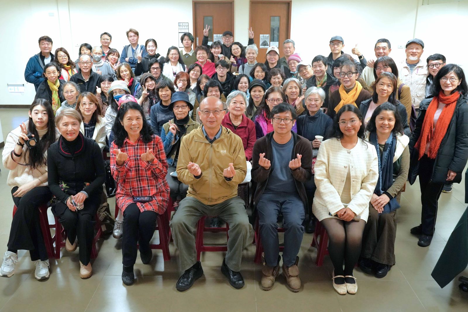 兩件作品最後贈給學生社團大齡圓夢社與美食社,感謝社員合辦此次展覽並提供豐富餐點,也展現了校園中跨域合作、自發學習的活力。展出期間即日起至17日止,地點在華梵大學圖資大樓三樓展覽空間。 全體師生合照。