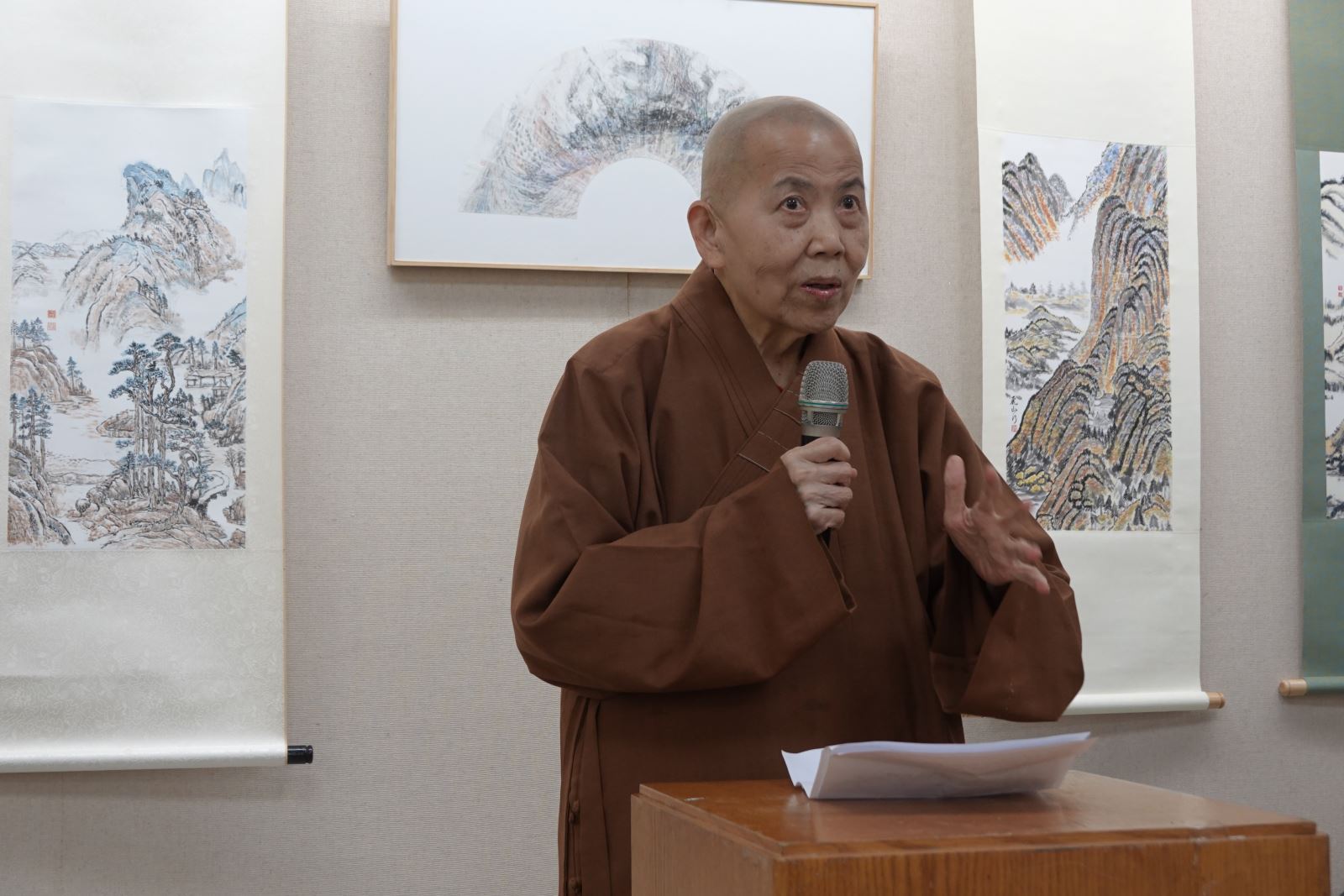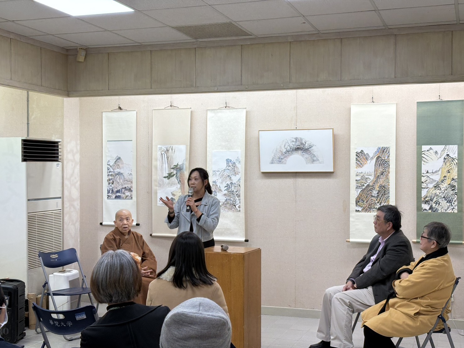 活動11日中午在華梵文物館登場,展現留法藝術家、華梵美術系畢業校友吳軒慧老師「水墨寫意技法」課程的教學與學生學習成果。現場高朋滿座,人氣爆棚,氣氛熱絡,學生紛紛搶著上台分享感言,到處充滿爽朗的歡笑聲。 蓮華學佛園修慈園長致詞。