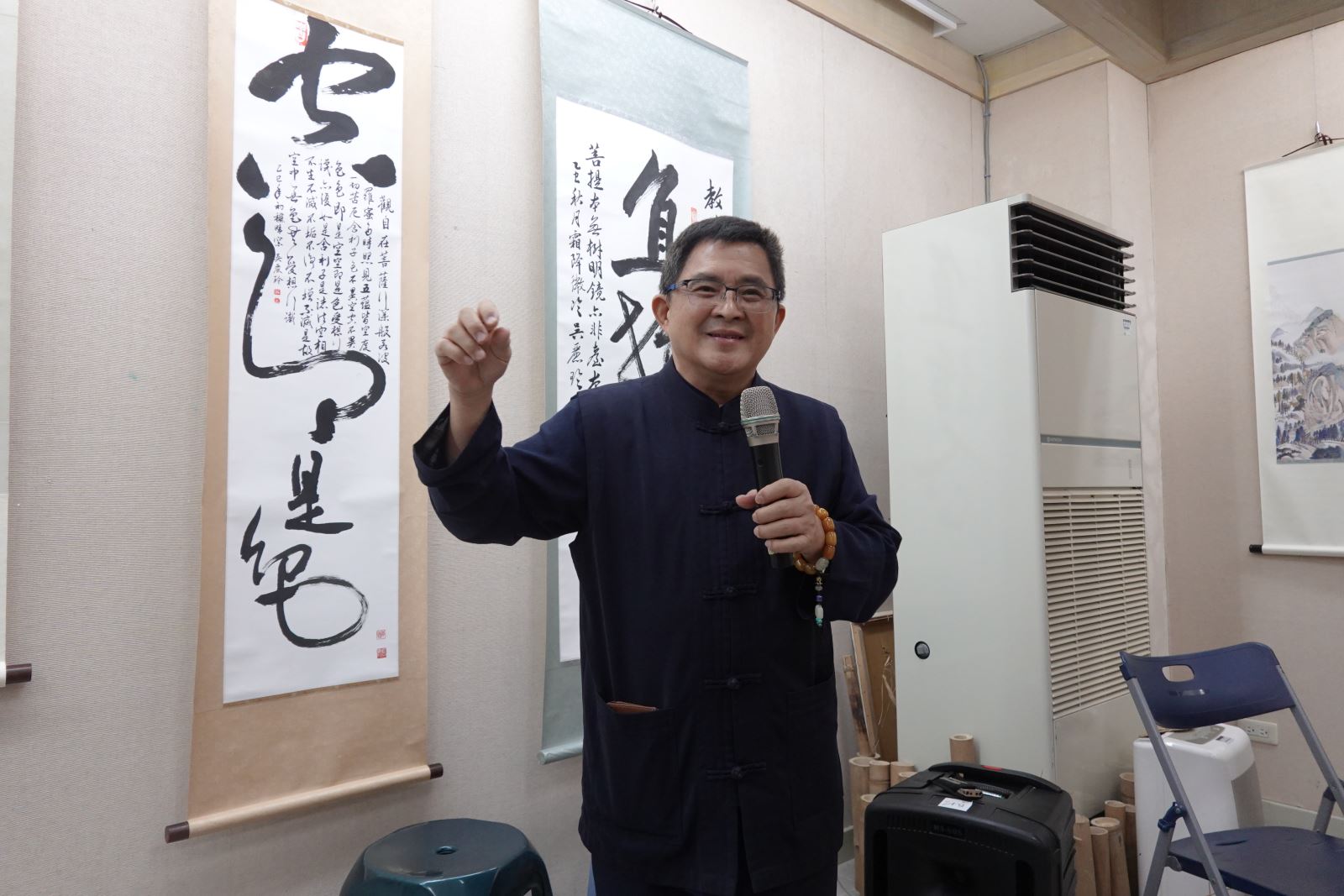 華梵文物館陳娟珠主任表示,大吳與小吳老師同為書畫藝術家,風格卻截然不同,小吳老師為巴黎第一大學藝術學博士,在傳統東方書畫的基底上又開拓出國際色彩與風格,令人眼睛為之一亮。大吳老師則打趣說,軒慧已經走出自己的路,「我現在不敢在家裡隨便評論小女了」。 被學生暱稱「大吳老師」的華梵佛藝系吳大仁助理教授致詞。