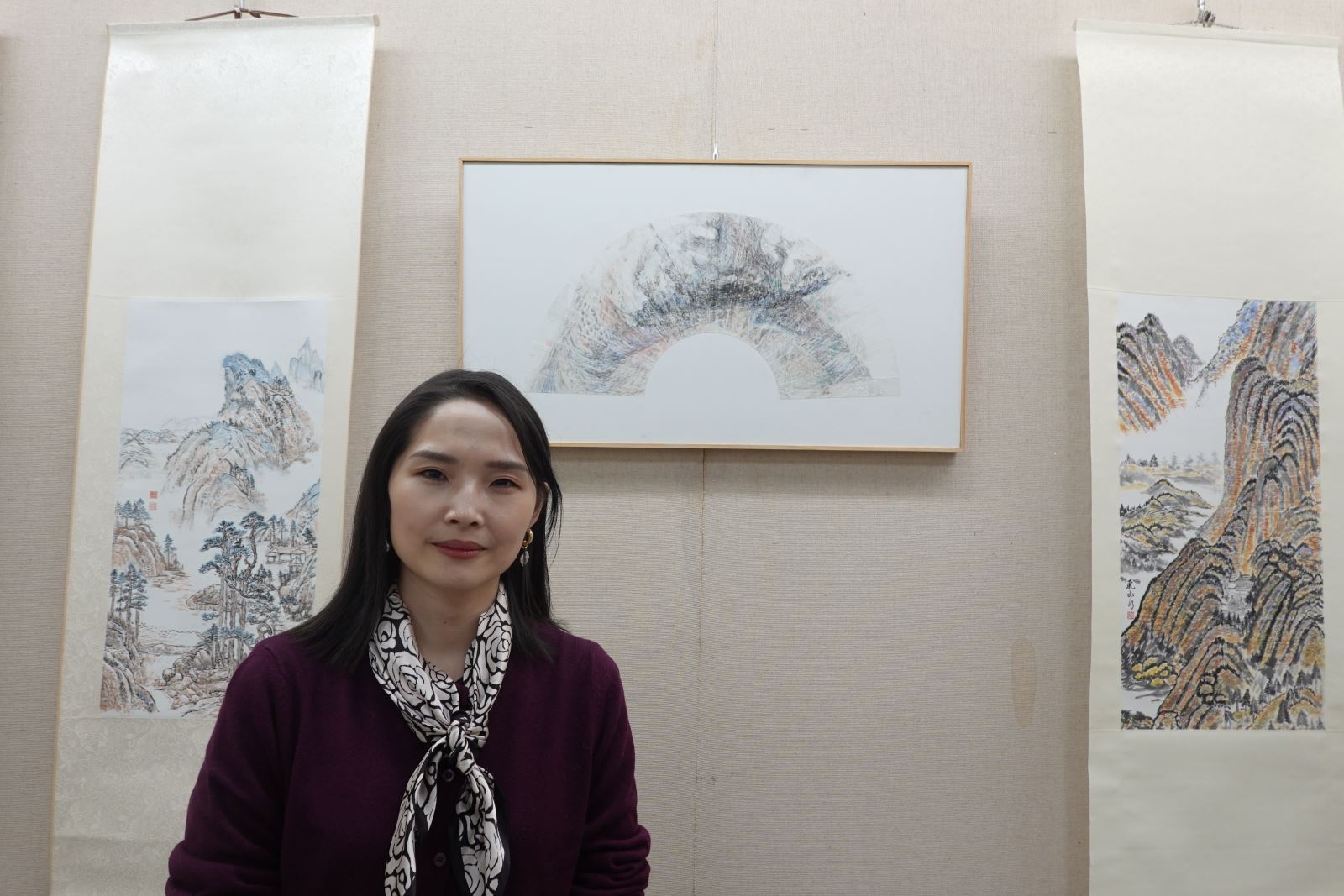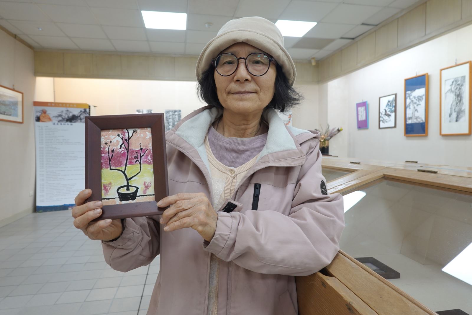 佛藝系二年級邱昱棋興奮直言,自己是從未接觸過寫意山水畫的「小白」,卻能一口氣展出四幅畫作;同班同學魏天嬌也感性分享,老師從素描、速寫開始,教大家了解光影和陰暗層次,再逐步引入皴法和渲染,讓沒有學過水墨的她畫出被先生喻為「鎮店之寶」的作品,真的眼界大開。 佛藝系二年級施玉雲展示自己在「寫意與技法」課堂中創作的玻璃畫。