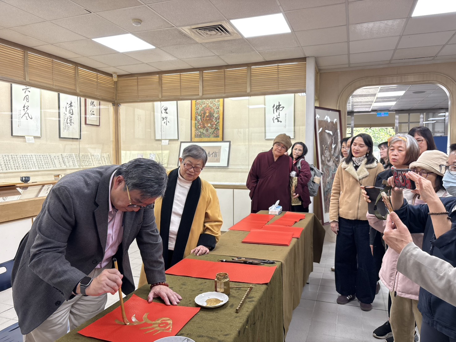 華梵文物館舉辦書寫春聯迎新歲活動,由李天任校長開筆,吳大仁老師帶領眾多學生集體揮毫寫春聯。 書寫春聯迎新歲,華梵大學歲末迎來熱鬧非凡的書畫盛會,先由佛教藝術學系吳軒慧助理教授帶領學生舉辦「水墨寫意技法成果展」,完美詮釋「全齡學習」與「生活禪」的理念,之後更由李天任校長開筆,和知名書法家吳大仁助理教授以及眾多學生集體揮毫寫春聯,為馬年討個好彩頭。 知名書法家、華梵佛藝系吳大仁助理教授揮毫寫春聯。