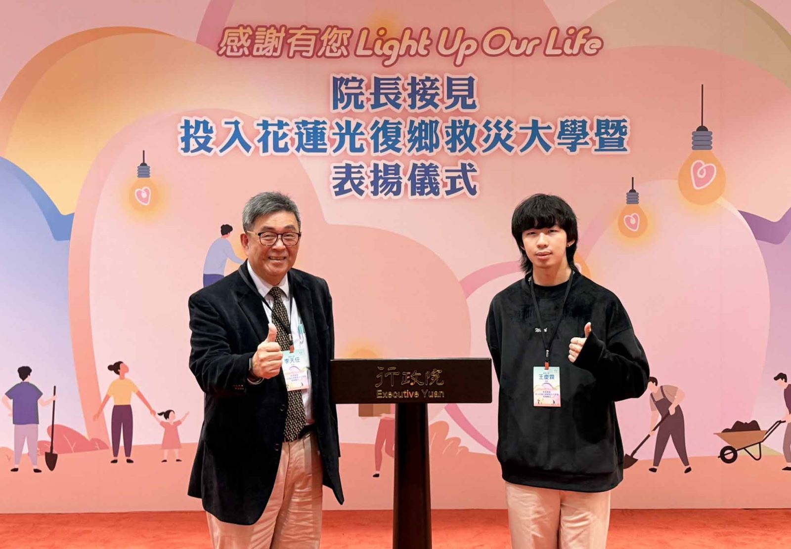 當災難降臨,最好的教育不在課堂,而在泥濘的土地上。華梵大學的「鏟子超人」,在災區體驗到了比課本更深刻的生命力量 。 華梵大學李天任校長與學生代表王慶霖合影。