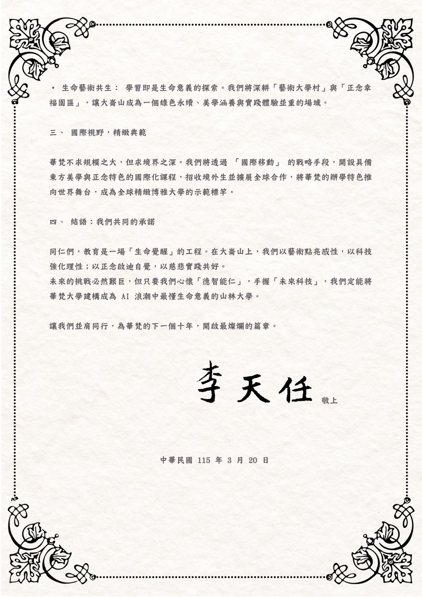 華梵大學李天任校長今日以公開信的形式,向全體教職員工發布「華梵2035」校務發展願景藍圖。 面對AI科技重塑文明的關鍵時刻,華梵大學李天任校長今日以公開信的形式,向全體教職員工發布「華梵2035」校務發展願景藍圖,未來十年將在既有的「覺之教育」基石上推動「生命覺醒」工程,透過AI轉型、全齡學習與國際移動,打造華梵成為AI浪潮中最懂生命意義的精緻博雅大學。