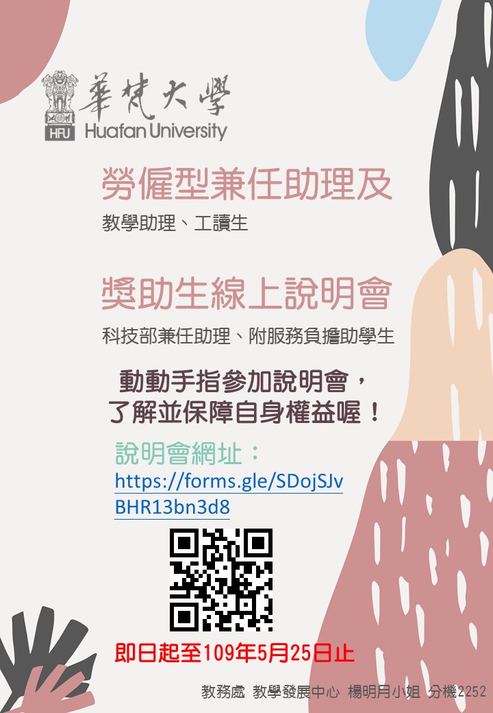 ♦「勞僱型兼任助理及獎助生線上說明會」及線上評量網址:https://forms.gle/SDojSJvBHR13bn3d8。