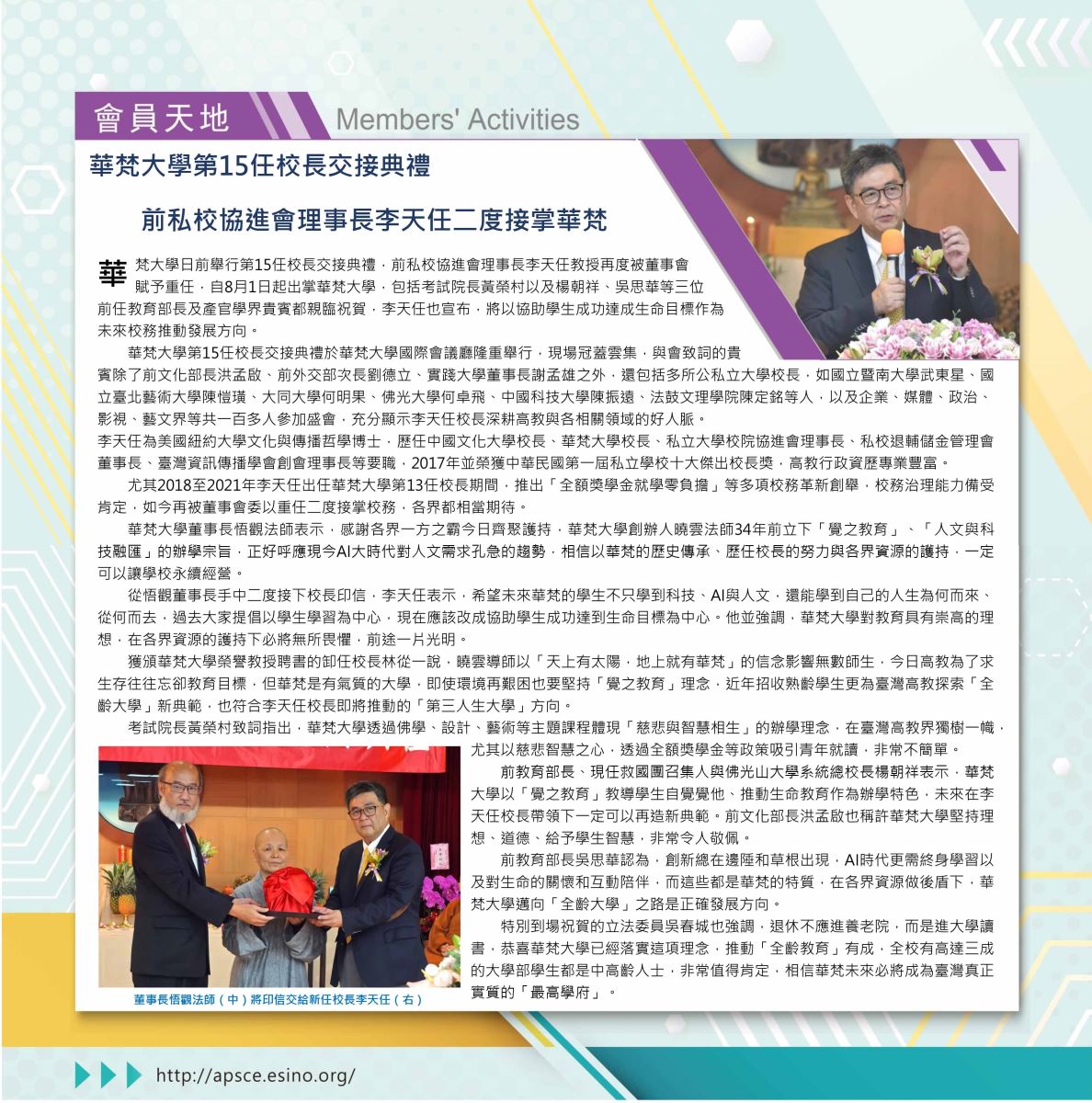 華梵大學第15任校長交接典禮 前私校協進會理事長李天任二度接掌華梵(私校教育期刊)