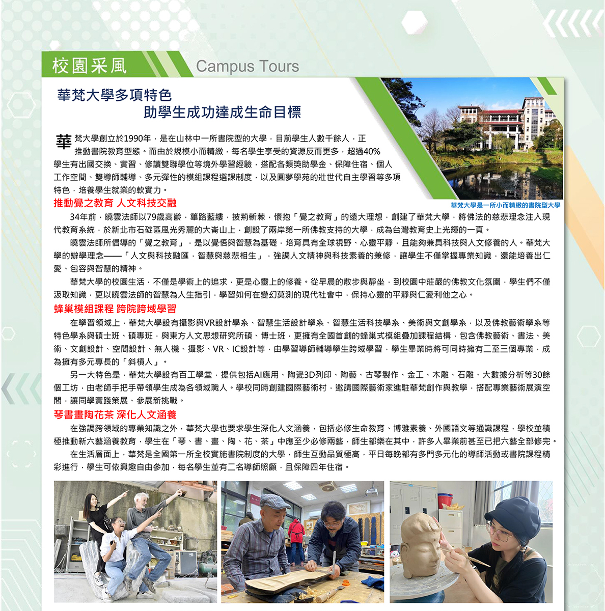 華梵大學創立於1990年,是在山林中一所書院型的大學,目前學生人數千餘人,正推動書院教育型態。而由於規模小而精緻,每名學生享受的資源反而更多,超過40%學生有出國交換、實習、修讀雙聯學位等境外學習經驗,搭配各類獎助學金、保障住宿、個人工作空間、雙導師輔導、多元彈性的模組課程選課制度,以及圓夢學苑的壯世代自主學習等多項特色,培養學生就業的軟實力。