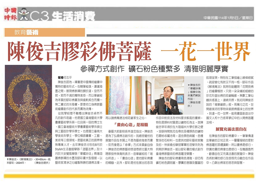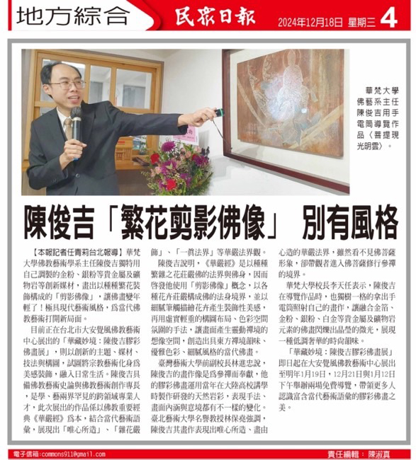 傳統佛畫都是以具象宗教人物為主角,供奉於神聖場域中,不免讓人產生「與生活美感脫節」的想法,然而在華梵大學佛教藝術學系主任陳俊吉的筆下,大膽採用自己調製的金粉、銀粉等貴金屬及礦物岩等創新媒材,畫出以種種繁花裝飾構成的「剪影佛像」,在手電筒等光線照射下,呈現「曖曖內含光」的低調奢華,讓佛畫變年輕,也極具現代藝術風格,
