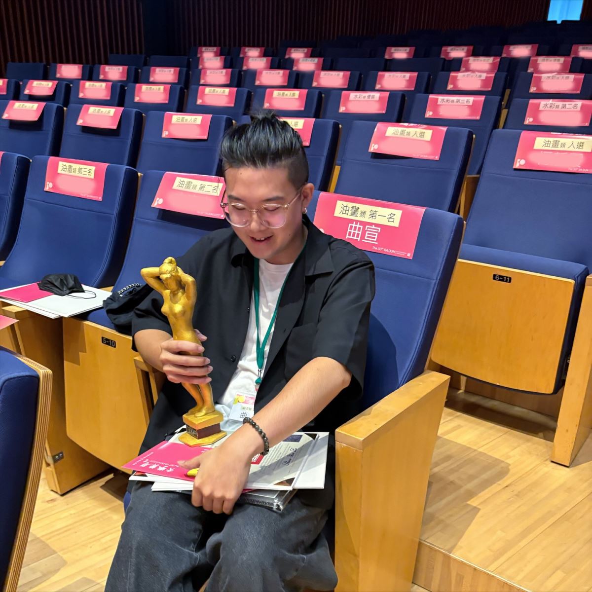 抱得大獎歸,曲宣坐在台下開心凝視手中獎盃。(摘自曲宣個人臉書)