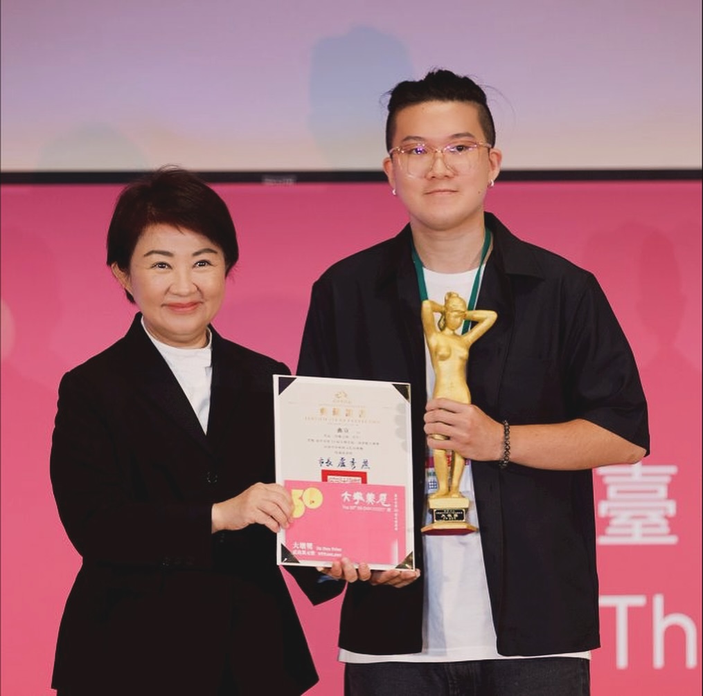 華梵大學美術與文創學系畢業校友曲宣(右)贏得大墩獎油畫類首獎,由台中市長盧秀燕頒獎。(摘自曲宣個人臉書)