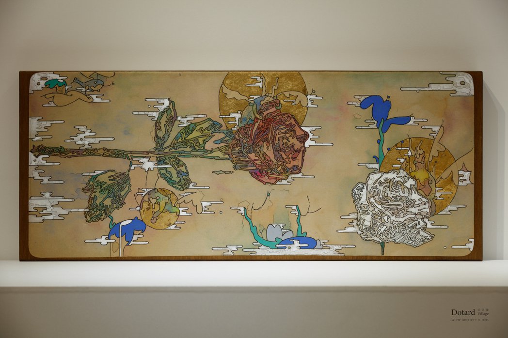 DOTARD VILLAGE GALLERY 台北,最新展覽企劃推出台灣當代藝術家-「六樓鐵皮」個展,同時也是藝廊首次的個展推薦,六樓鐵皮1985年於華梵大學藝術系受過扎實的水墨訓練後畢業,再到台南藝術大學藝術創作研究所進修畢業;在大學時期使用牛皮紙材質勇於嘗試突破傳統,不僅不受傳統材料的限制,還自創突破傳統,大膽使用當代的石青石綠,這種台灣鐵皮建築用色獨樹一格。而金色是一種無法使用電腦完全展現的顏色。因此作者使用金箔,這種複合材料中的新興藝術表達顏色。這是一種最輝煌的光澤色,更是大自然中至高無上的純色,它是太陽的顏色,它代表著溫暖與幸福,也擁有照耀人間、光芒四射的魅力。