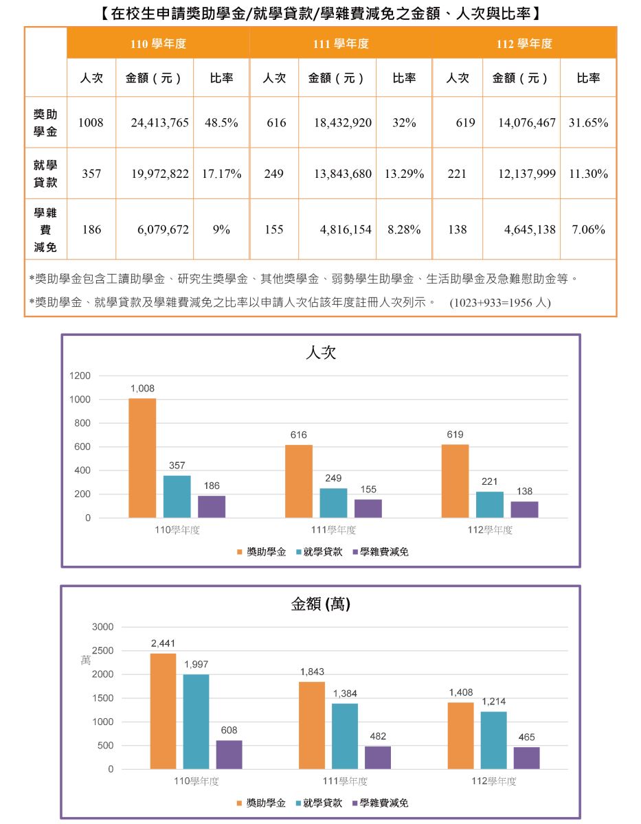 在校生申請就學貸款/獎助學金/學雜費減免之金額、人數與比率