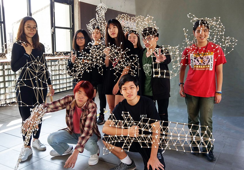 「我是小小構成主義大師」!華梵大學學生以小小的保麗龍球與小牙籤構成有趣的造型結構。(藝設中心提供)