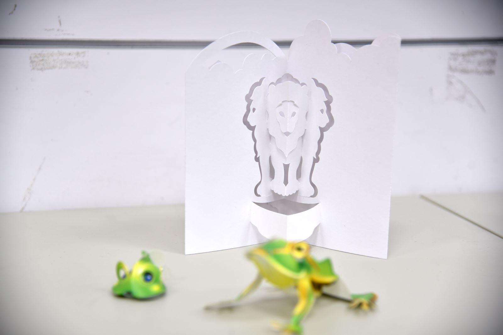 洪老師以阿育王柱為題材,創作的紙雕卡片。
