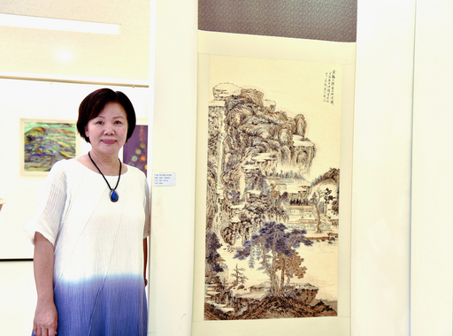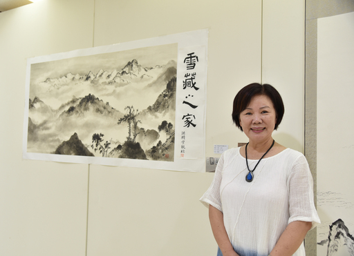 華梵大學美術系研究生洪精雪臨摹嶺南畫派女畫傑曉雲法師的畫作《雪藏之家》。