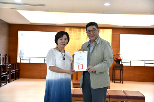 更令人讚嘆的是,洪精雪在校六年一路護持華梵,力行財施、法施、無畏施,至今已累積捐贈近20萬元給美術系與人文藝術學院,此次又發心將展覽所得全數捐出,充分實踐「覺之教育」利他覺他的宗旨,華梵大學書院長兼人文與藝術學院院長黃智陽教授特別頒贈感謝狀,表揚她的善行。
