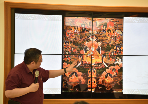 擁有哈佛大學梵文與印度研究碩、博士學位,曾於佛光大學擔任佛教學系主任與佛教學院代理院長的劉國威教授,是藏傳佛教研究專家,經常來往世界各地進行考察研究與參與國際學術研討會,此番前來華梵演講,從唐卡的意義、創作動機、起源、構圖、創作類型、繪畫主題、分類與命名等角度切入,依照發展時期與區域的不同,分析介紹唐卡藝術的流變與歷史文化。