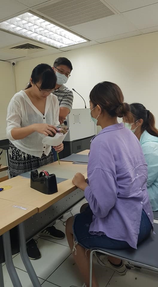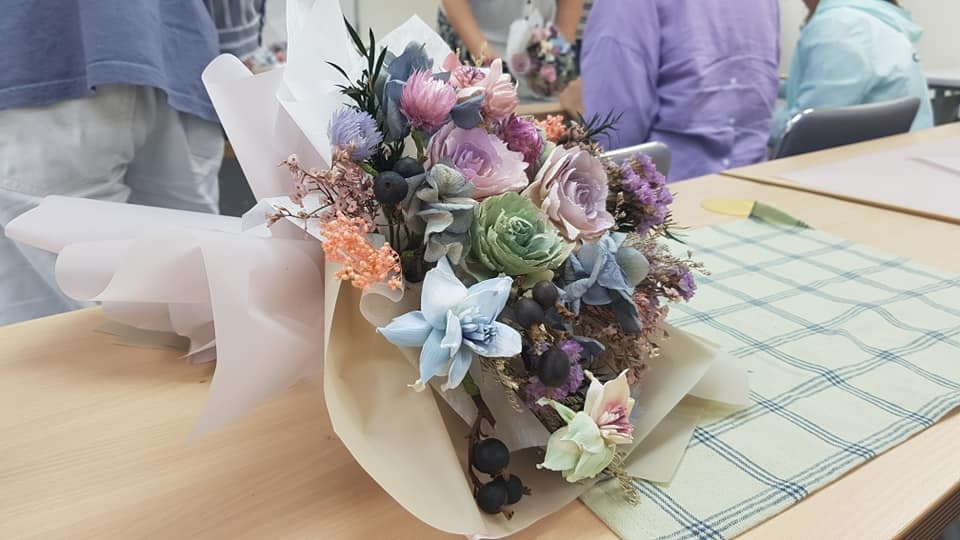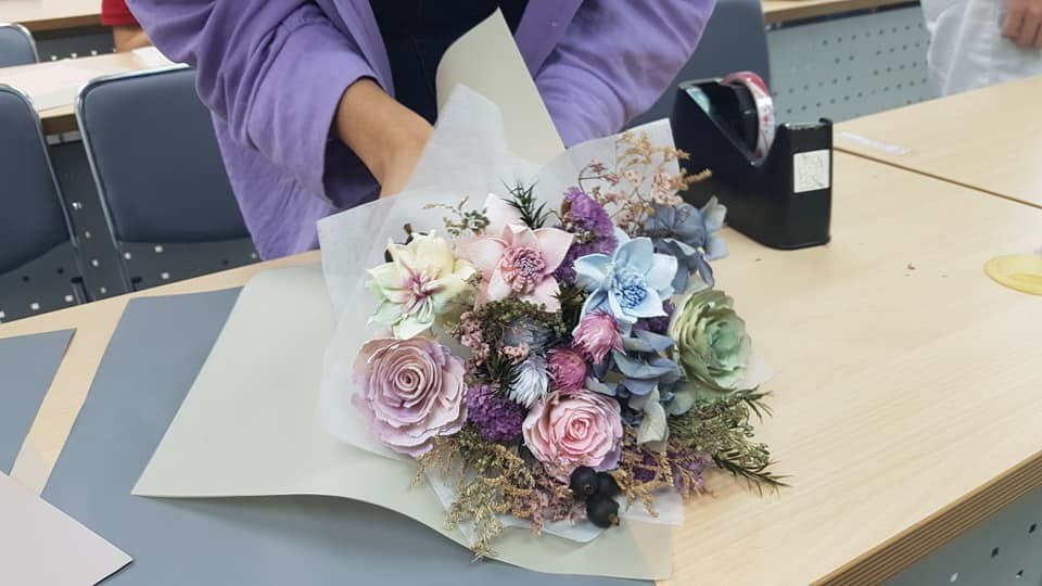 透過本次課程的學習,老師講解目前台灣不凋花市場需求和需要具備哪些能力,以及如何創業和中國及日本材料的價格和品質差別為何。實際操作後發現鮮花和不凋花花束的製作方式差異非常大,而且不凋花的花材是經過加工製作,可以保持很久但是價格也相對比較貴,所以學生如果想要朝不凋花創業的話,除了成熟和快速的包裝技術外,還是評估市場和以網路還是實體店面創業為佳。