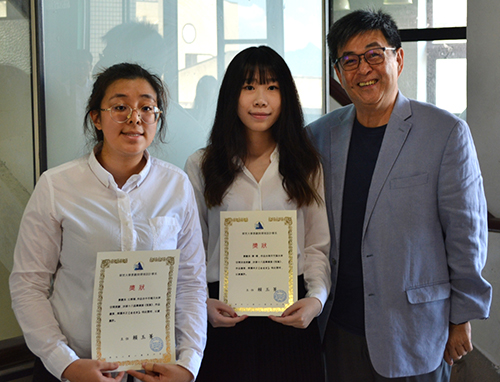 景觀系四年級江榮珊同學(左)與陳靖同學(中)榮獲作品優選獎,由李天任校長親自表揚。