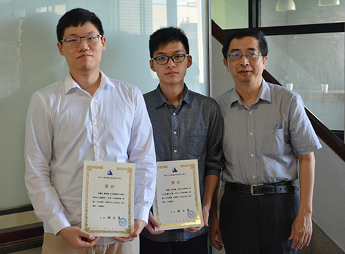 景觀系四年級黃家豪同學(左)與潘鶴白同學(中)榮獲作品特優獎,由蔡傳暉教務長頒獎表揚。