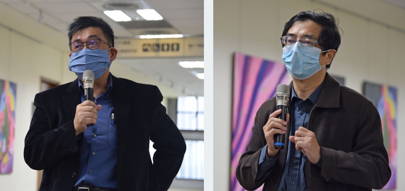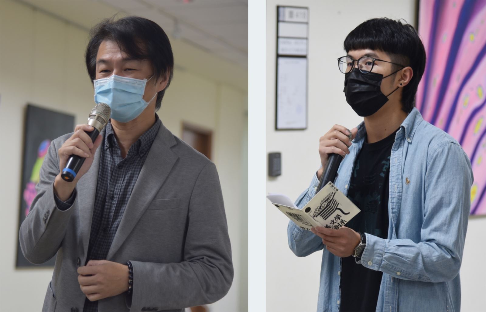 人文與藝術學院黃智陽院長(左)、美創系四年級畢展總召李俊逸同學(右)致詞。