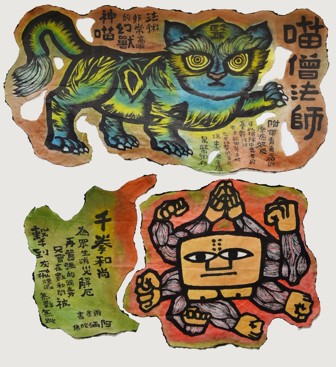 華梵大學美創系學生劉康彥創作出能消滅病毒的「喵僧法師」和「千拳和尚」。