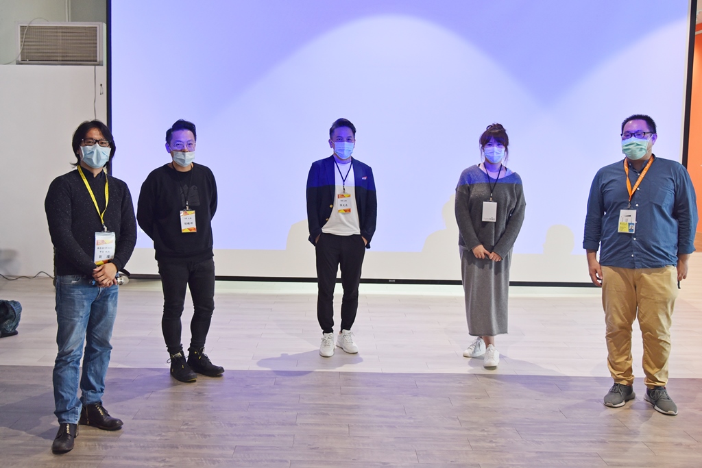 胡縉祥總監(左二)與張文杰執行長(中)於「2020VR大師講堂」發表專題演講,與攝影與VR設計學系傅子恒老師(右一)、曾瀚儀老師(右二)、劉躍老師(左一)相見歡。