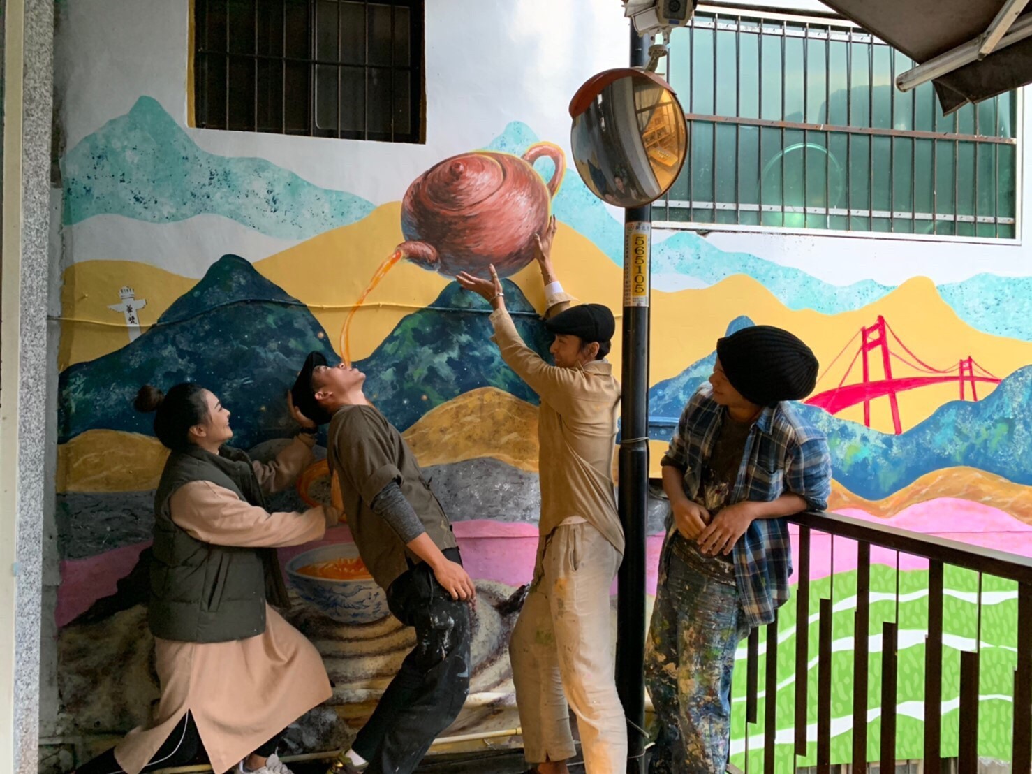彩繪牆是由美術與文創學系校友、H平方計畫團隊負責人董其融(左二),帶領美創系大四學生施作完成。