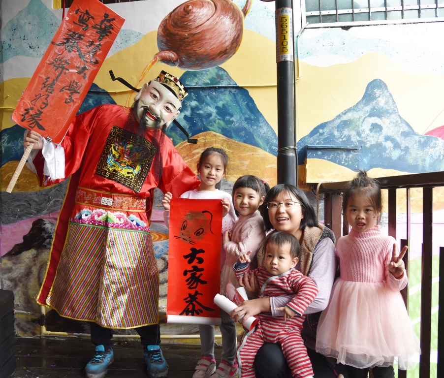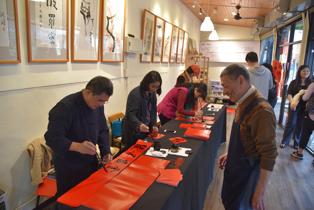 「淡蘭一號」位於石碇農會後方老街溪畔,是華梵大學師生與社區居民凝聚共識的地方創生平台。趁著今日週末人氣高,一大早即先展開「鼠來報喜」活動,邀請名書法家、華梵大學人文教育研究中心吳大仁老師現場揮毫書畫春聯,民眾只要大聲說出一句吉祥話,就可以領到名家手寫手繪的「創意畫春聯」,以及華梵大學精心設計的紅包袋,吸引人潮絡繹不絕前來參加,並在活潑亮麗的彩繪牆前拍照留念。