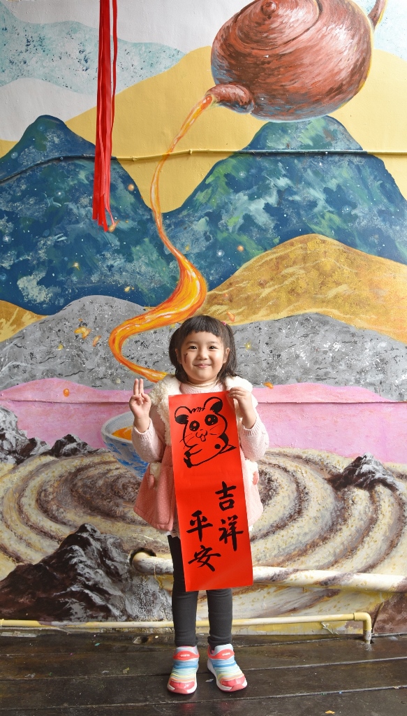 小妹妹拿著繪有「哈姆太郎」的「畫春聯」,在「淡蘭一號」彩繪牆前拍照留念。