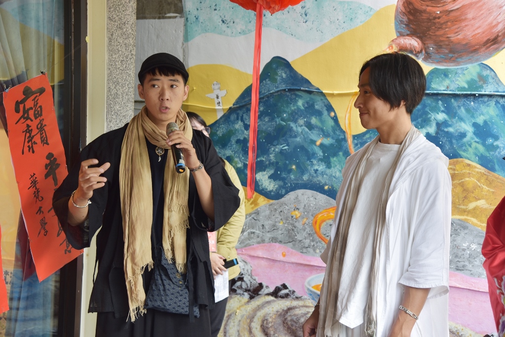 華梵大學美術與文創學系校友董其融(左 )與團隊夥伴說明彩繪理念。