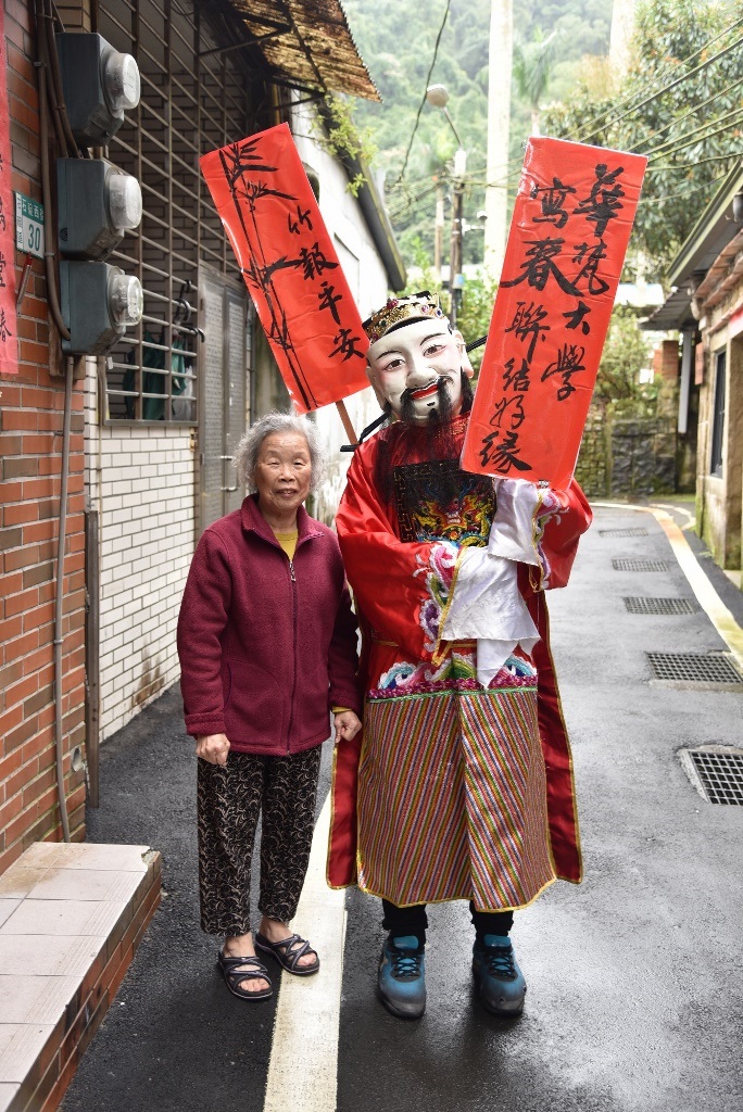由學生裝扮的華梵財神爺來到石碇社區與居民同樂。